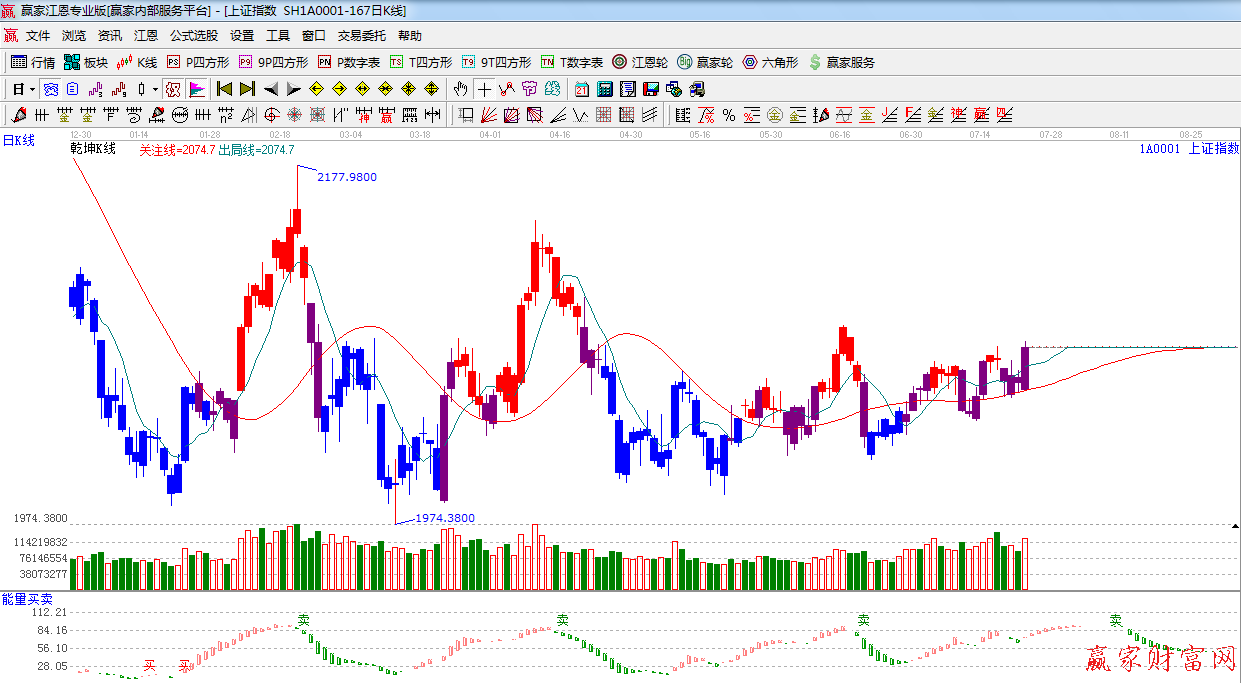 ★依據贏家江恩系統乾坤K線提示: 關注線位置拉起中陽線,紫色k線,警示信號,謹慎為主。