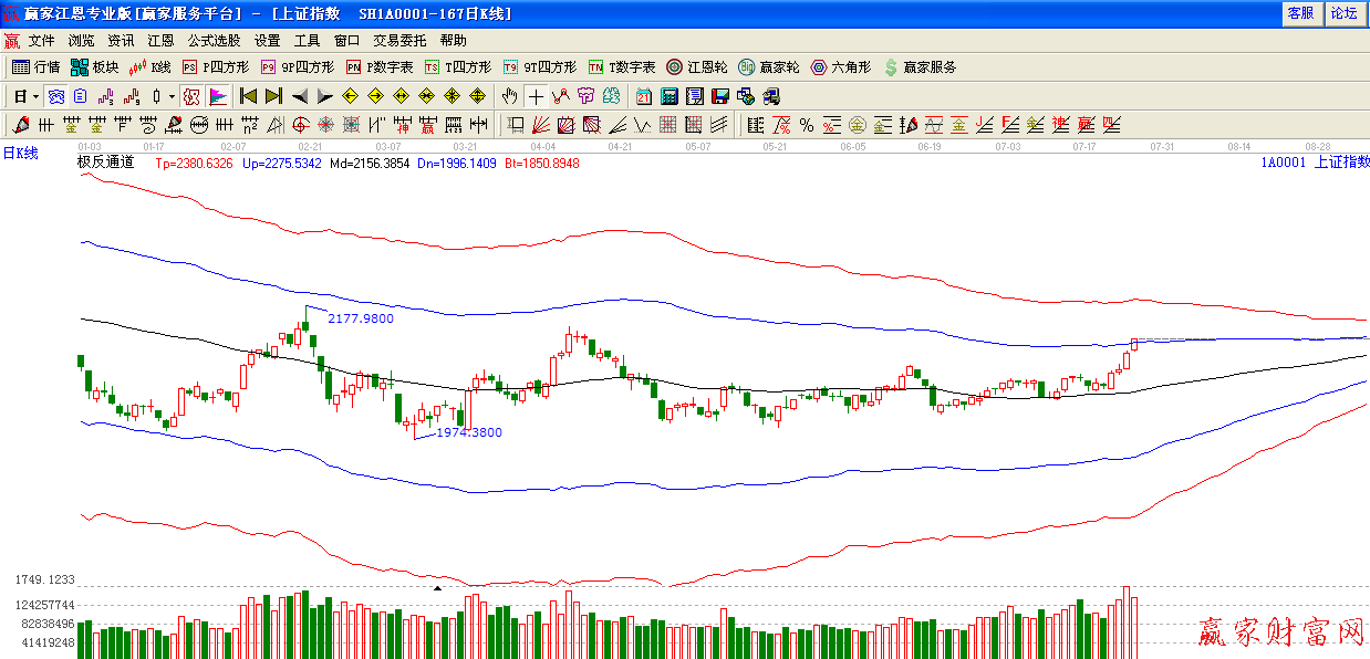 江恩看盤綜述:依據贏家江恩技術工具分析得出:在權重的帶動下,指數繼續強勢上攻,突破極反通道藍色外軌線,短期面臨前期頭部2146點阻力,周一留意沖高回落動作,7月28日又是前期提到時間窗口。謹慎留意盤面變化。