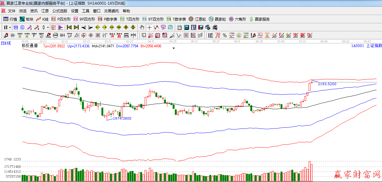盤面上,個股板塊漲多跌少,航天軍工,國產軟件,鋰電池,倉儲物流等板塊表現活躍,藍籌股出現分化,鋼鐵、有色、煤炭等出現不同程度的回調,只有房地產和券商板塊上漲,今日題材股表現好于權重股,指數上攻動能在衰減,而且指數也逼近極反通道紅色外軌阻力線附近,預計短期大盤將沖高回落。