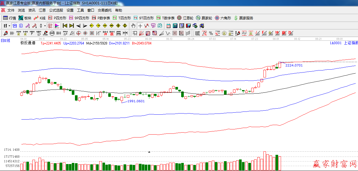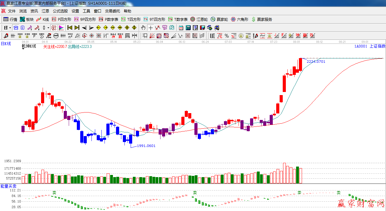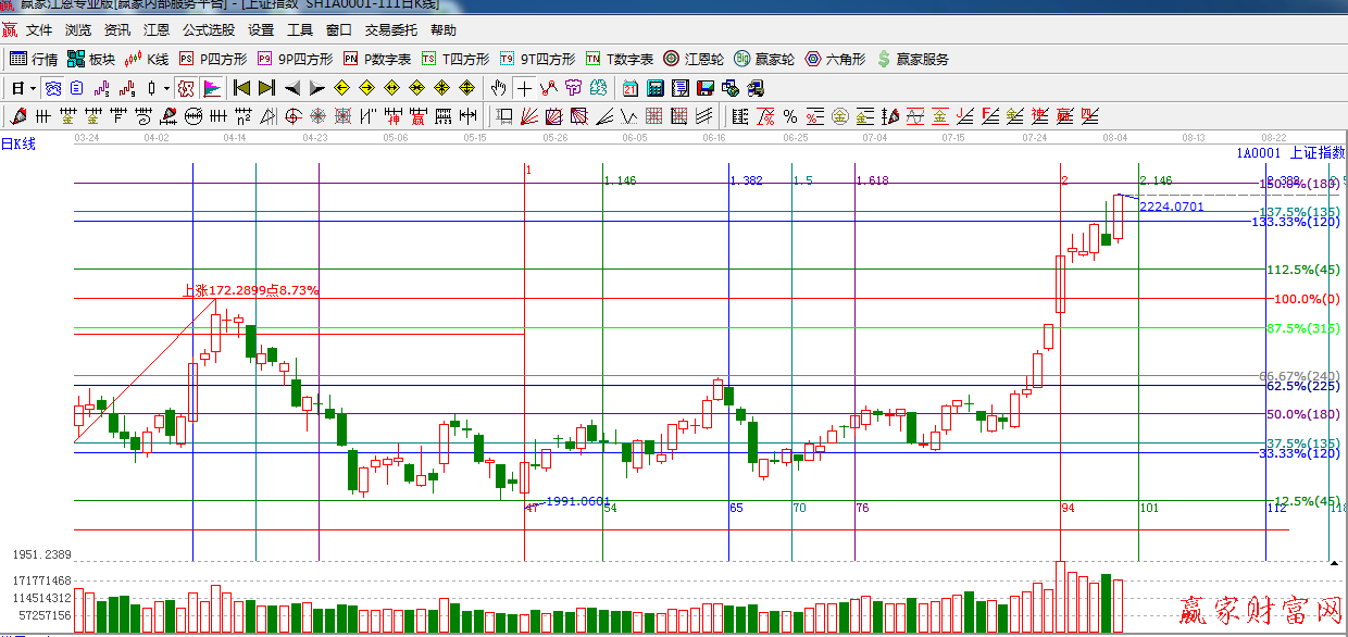 江恩看盤綜述:依據(jù)贏家江恩技術(shù)工具分析得出:周一指數(shù)在權(quán)重的全面推動(dòng)下,再創(chuàng)新高,量能較前期縮小,預(yù)計(jì)短期指數(shù)將震蕩沖高后回落。上方阻力為江恩180度 2232點(diǎn),225度2254點(diǎn),時(shí)間窗口8月6日。操作上,合理控制倉(cāng)位,做好高拋低吸。