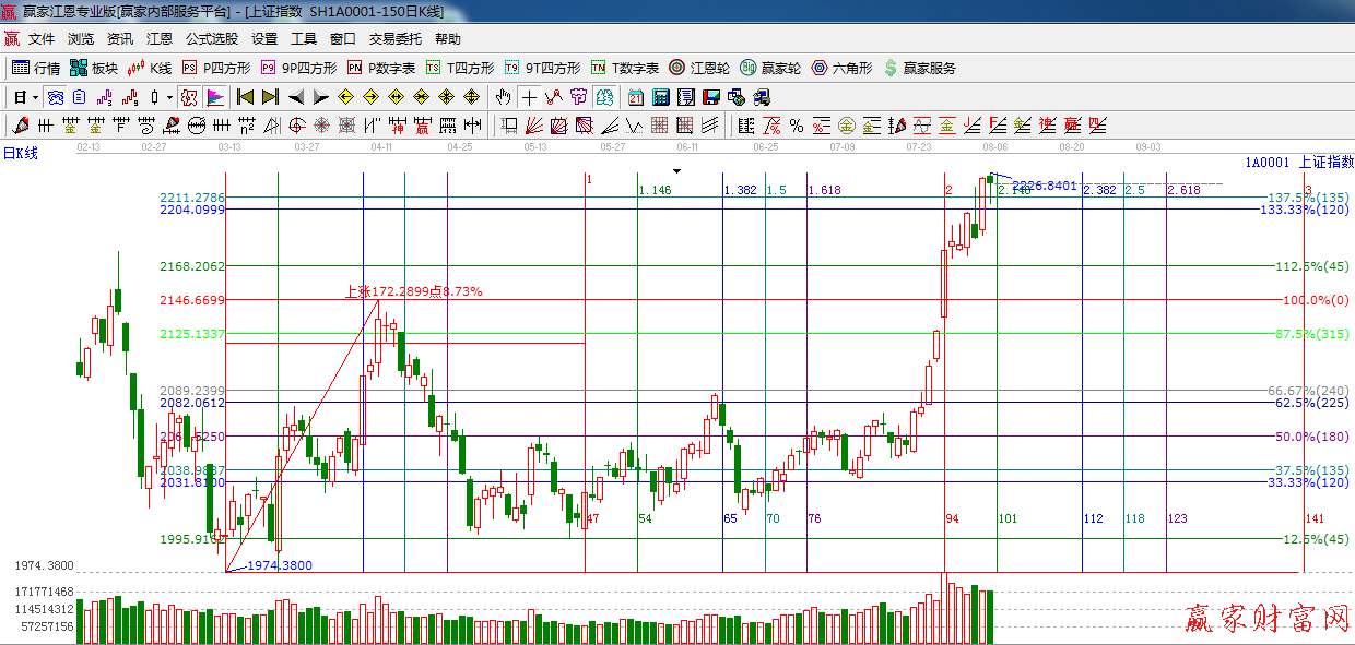 ☆依據(jù)贏家江恩系統(tǒng)黃金時間周期線提示:本周時間窗口是8月06日