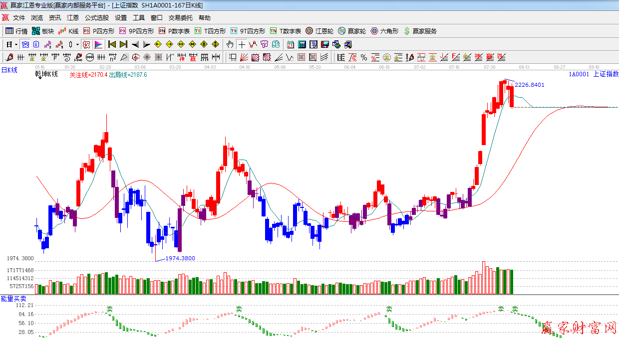 江恩看盤綜述:依據贏家江恩技術工具分析得出:8.6日窗口之后,立秋節點,指數迎來中陰下跌,主因在于權重股集體撤退,創業板的反彈未果,回落調整屬于正常走勢,下方支撐外軌線2168點附近,預計周五大盤將維持弱勢震蕩