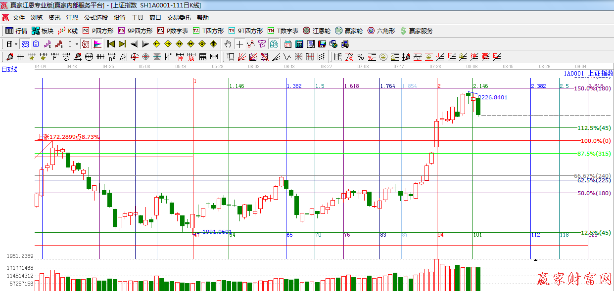 ☆依據贏家江恩系統黃金時間周期線提示:昨天寫到8月06日窗口,指數有誘多嫌疑,如期中陰下跌,