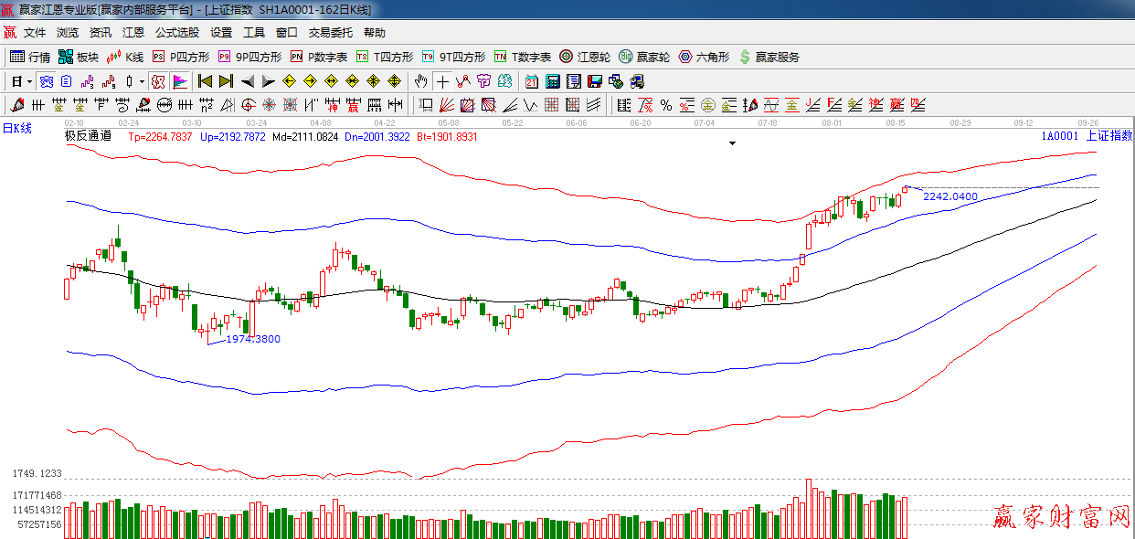 ★依據贏家江恩系統極反通道提示:創出近期新高,極反通道紅色外軌阻力是 2260附近。