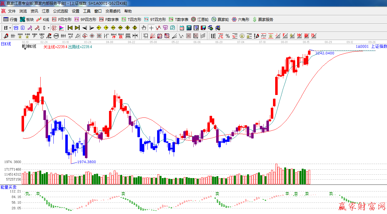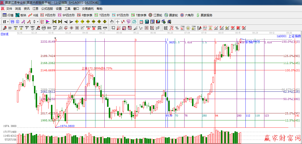 江恩看盤綜述:依據贏家江恩技術工具分析得出:指數高開,突破180度2232點,創出近期新高,題材股活躍,權重股滯漲,接近2254,2261點,拋壓會越來越重,預計 周二大盤繼續高位震蕩。