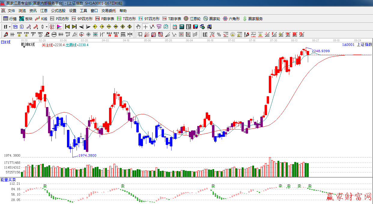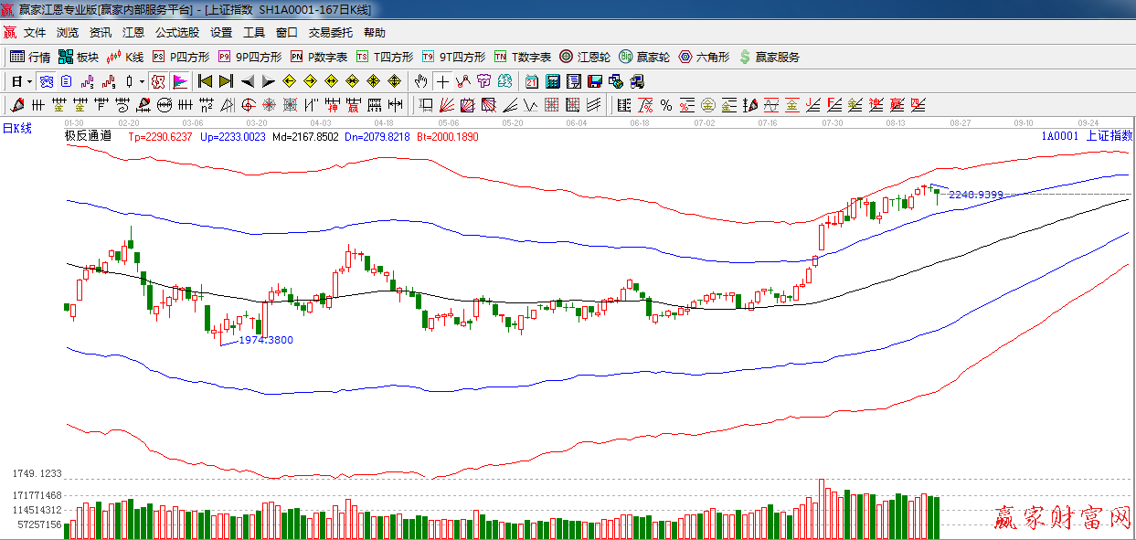 ★依據贏家江恩系統極反通道提示:周四如期回探,終盤吊頸線收盤,下方藍色外軌線支撐是2200點。