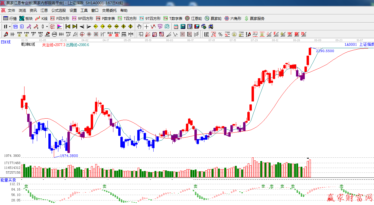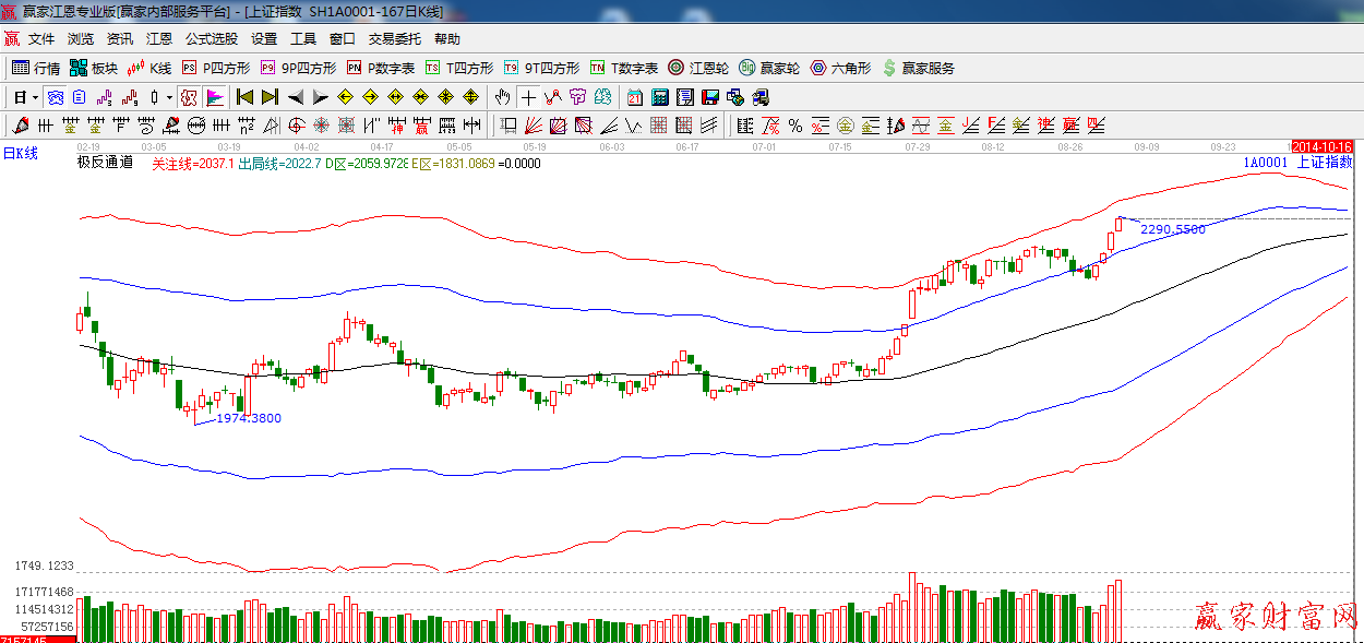 ★依據贏家江恩系統極反通道提示:繼續放量上行,整體趨勢看多,上方外軌線阻力2318點附近。