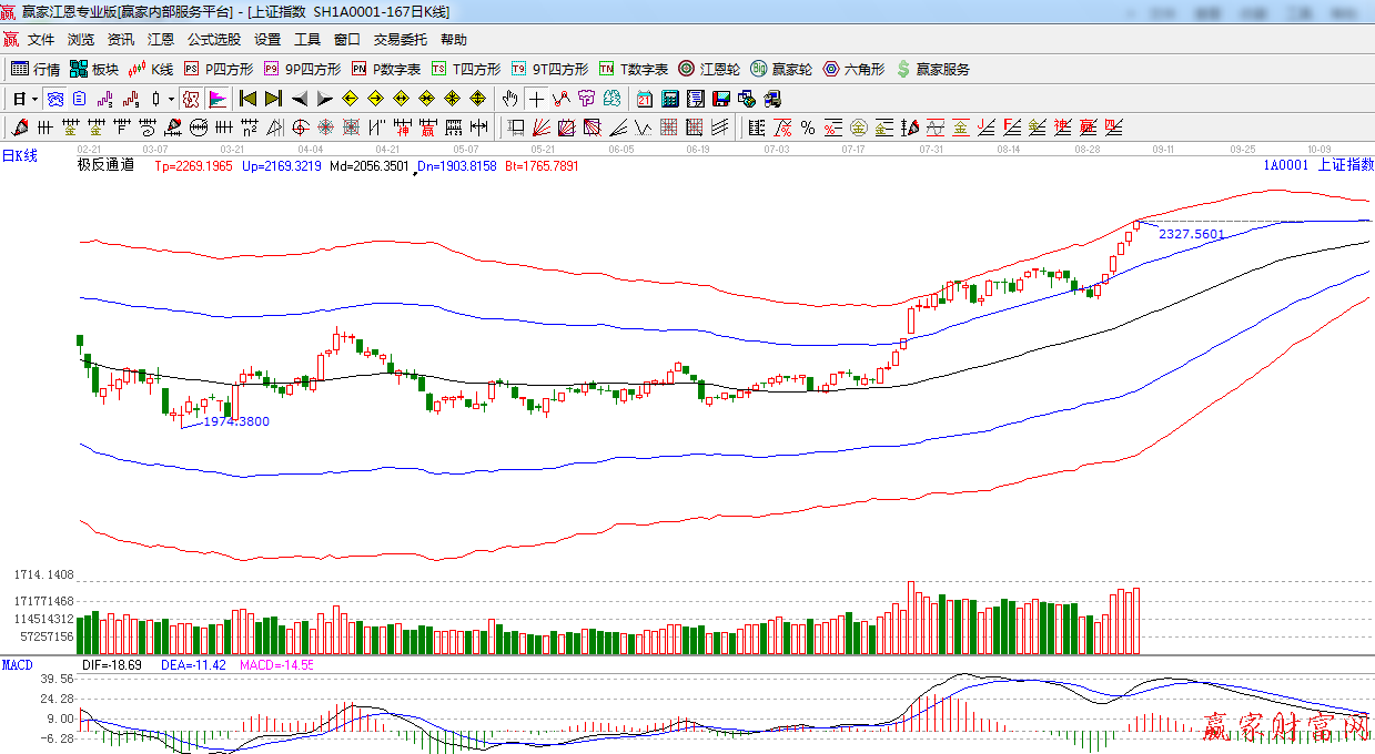 江恩看盤綜述:依據贏家江恩技術工具分析得出:上周五又是前期提到的時間之窗,指數又面臨上方極反通道紅色外軌壓力,短期將結束前期伶俐走勢,轉入震蕩,預計本周將沖高回落,創出階段小高點,操作上,合理控制倉位,謹慎為主。