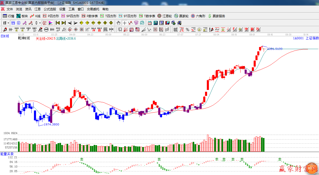 ★依據(jù)贏家江恩系統(tǒng)乾坤K線提示:k線處于紅色可操作區(qū)域,謹慎看多。