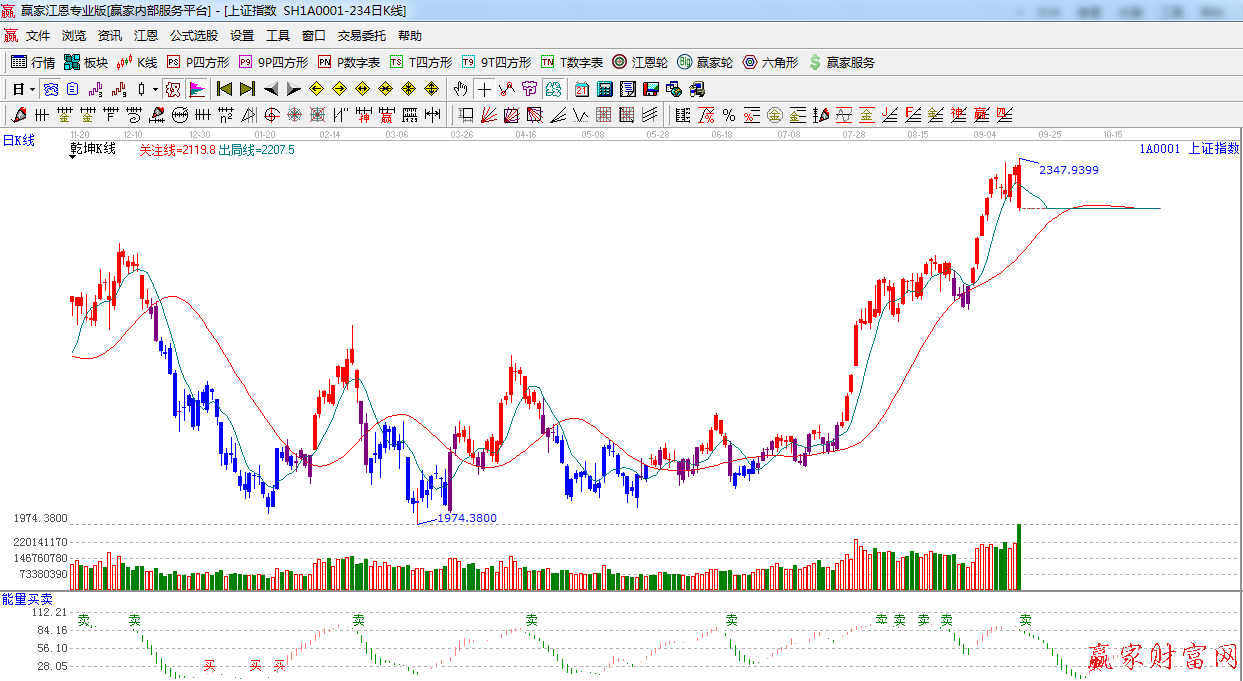 ☆依據贏家江恩系統能量買賣提示:昨天寫到出現多空臨界點,看多能量柱有背離跡象,今日賣出現,謹,短線看空。