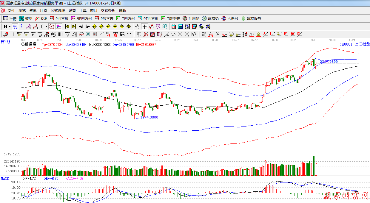 ★依據贏家江恩系統極反通道提示:外軌線上方縮量整理,外軌線支撐,2300點 ,此位置不破,謹慎看空。