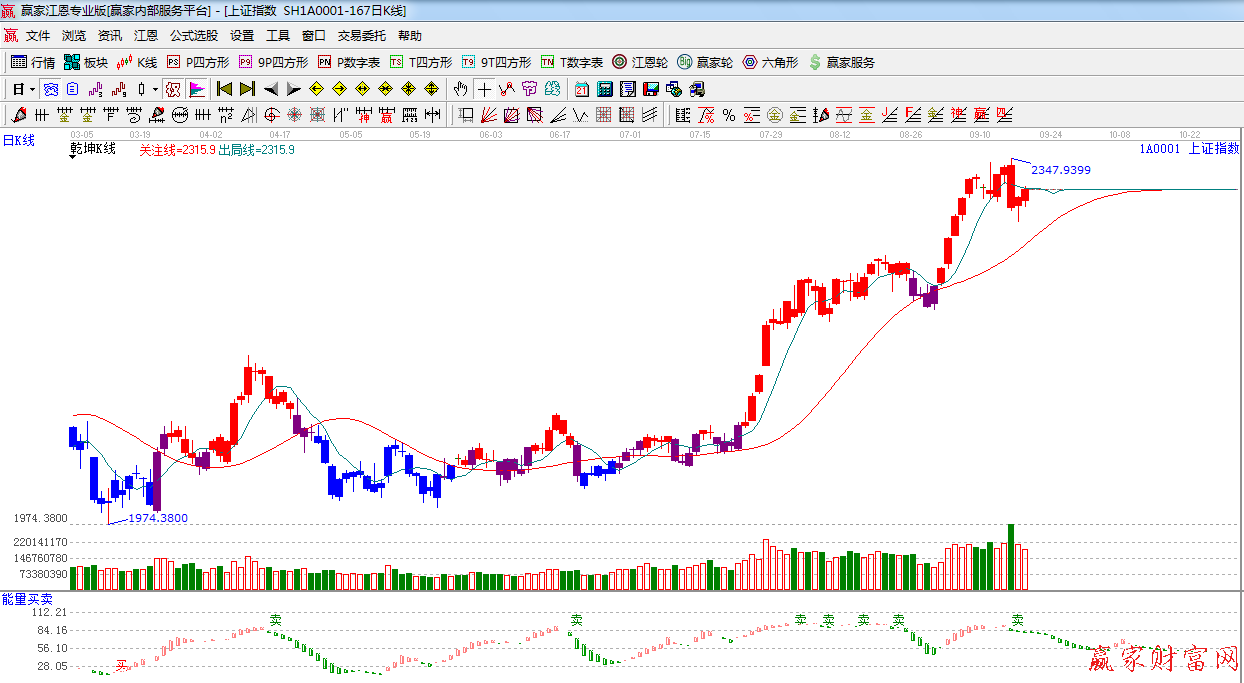 ☆依據贏家江恩系統能量買賣提示:持續出現綠色看空能量柱,伴隨“賣”字提 示,短線謹慎看空。