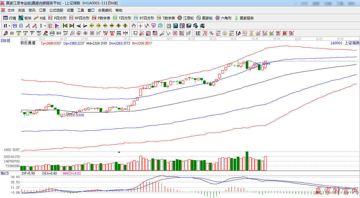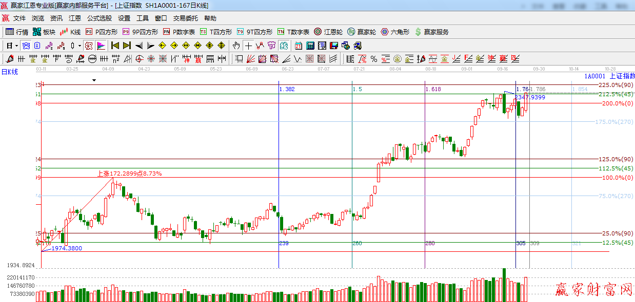 ★依據(jù)贏家江恩系統(tǒng)波段百分比提示:放量突破,0度,45度阻力線,短期阻力位 是2330-2340點(diǎn),上方面臨阻力位90度,2362點(diǎn)。