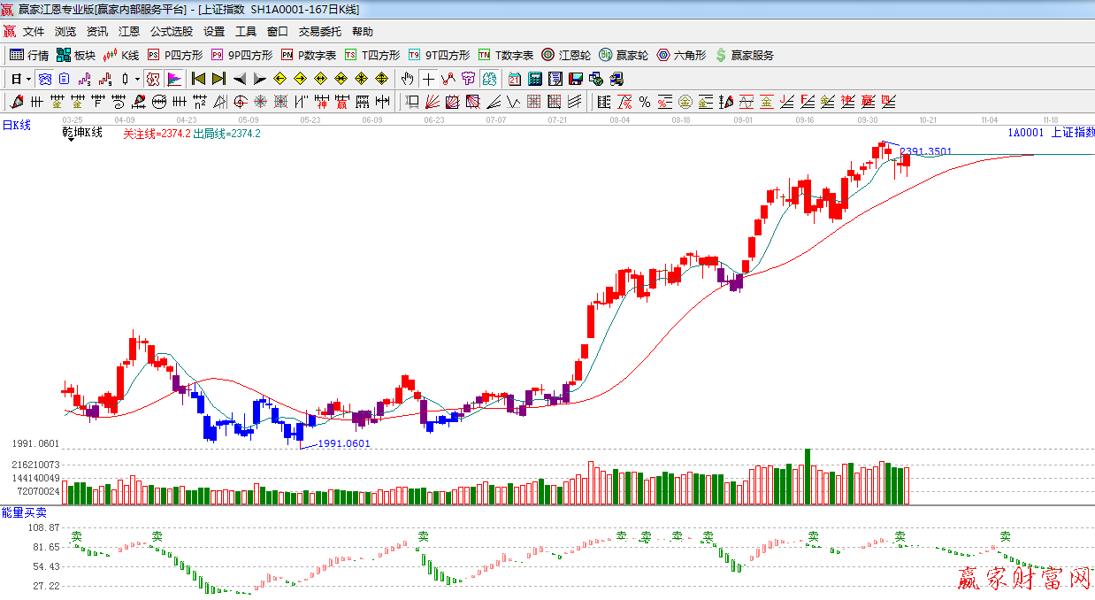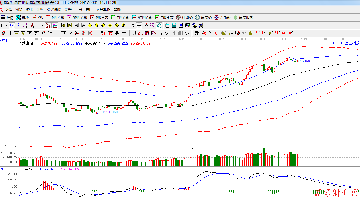 ★依據贏家江恩系統極反通道提示:60分生命線獲得支撐,反彈,日線藍色外軌線之下收盤,小陽線,明日繼續關注外軌線阻力。