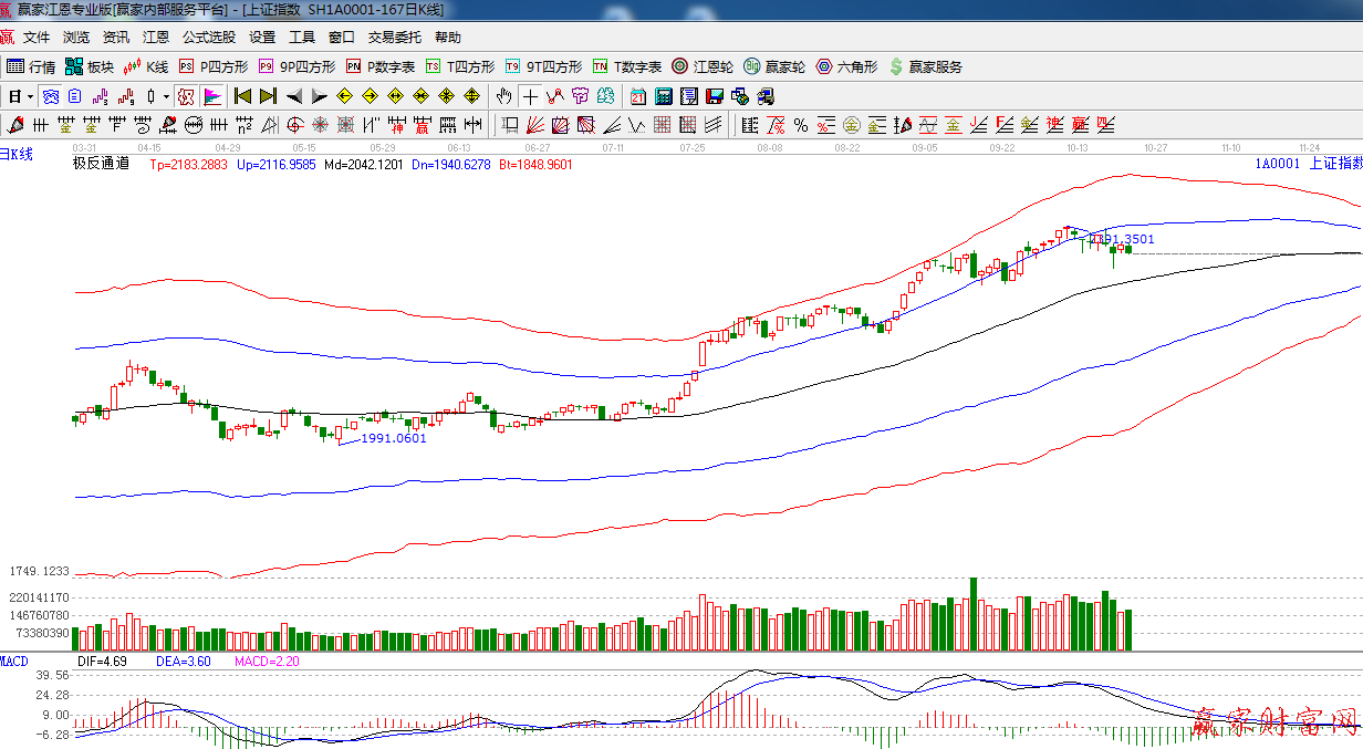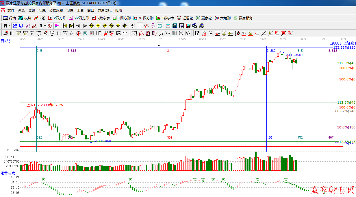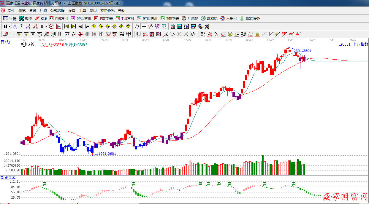 ★依據贏家江恩系統極反通道提示:在藍色外軌線之下,放量小陰線,短期保持謹慎態度,生命線支撐2290附近。