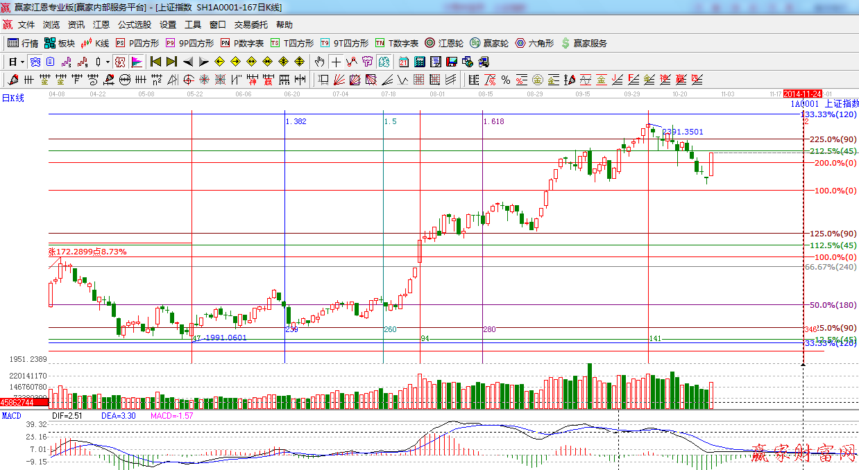 ☆依據(jù)贏家江恩系統(tǒng)黃金時間周期線提示:下一重要時間窗口是11月24日附近。