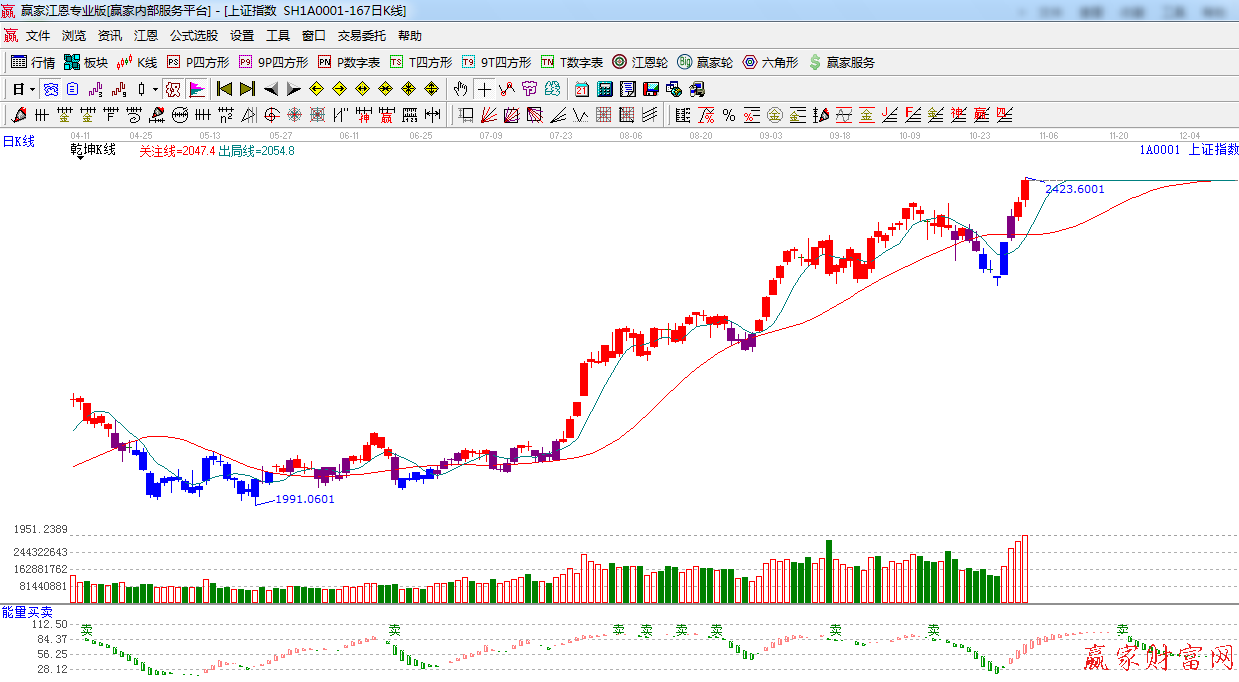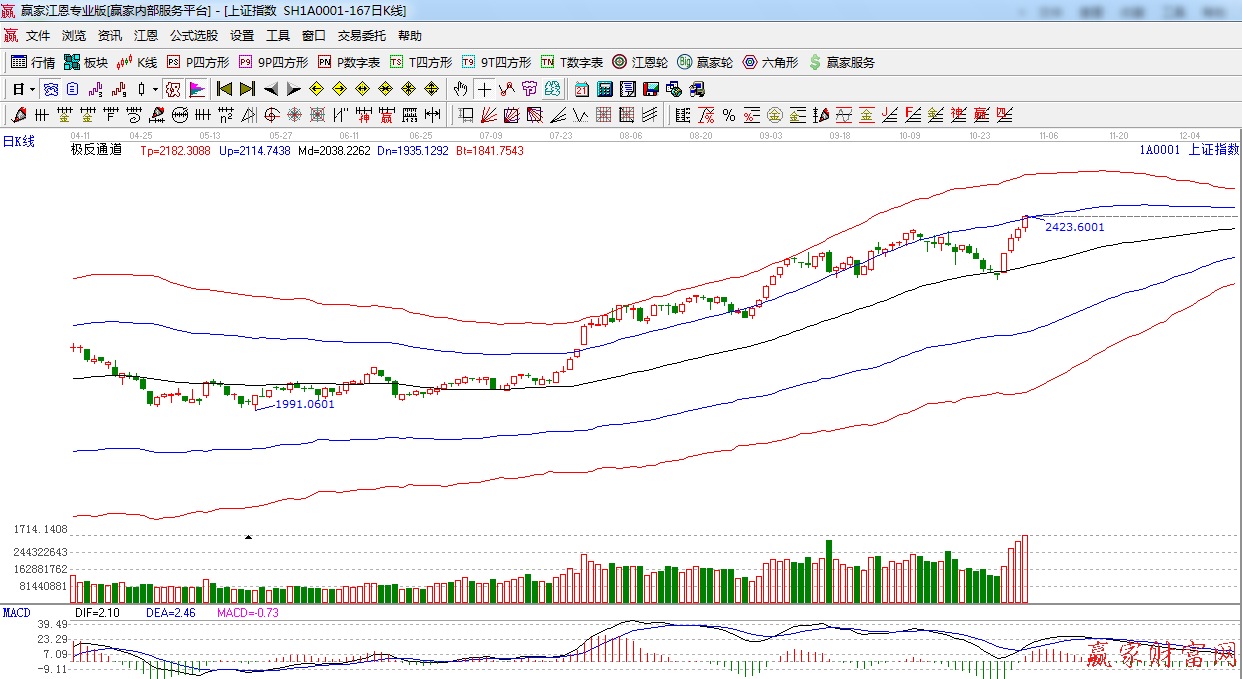 ★依據贏家江恩系統極反通道提示:指數繼續放量上行,突破藍色外軌2410點,留意后期量能,如不能支持,此位置將仍有反復。