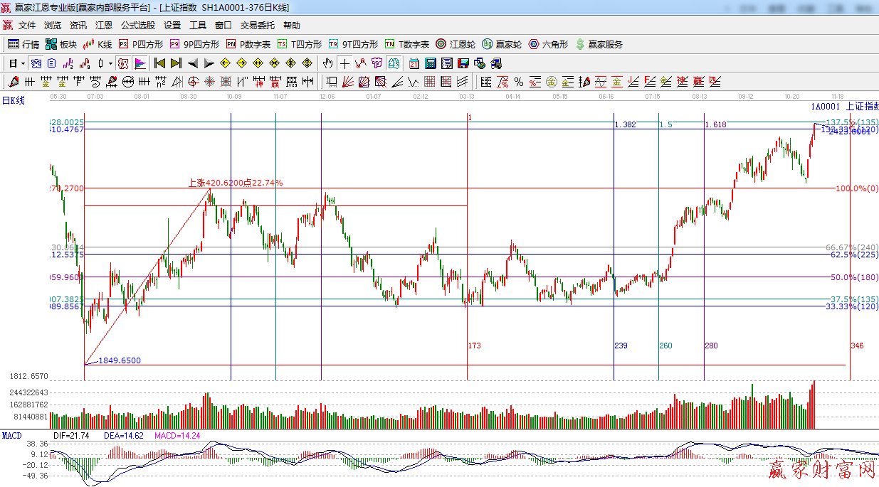 ☆依據贏家江恩系統黃金時間周期線提示:下一重要時間窗口是11月24日附近。