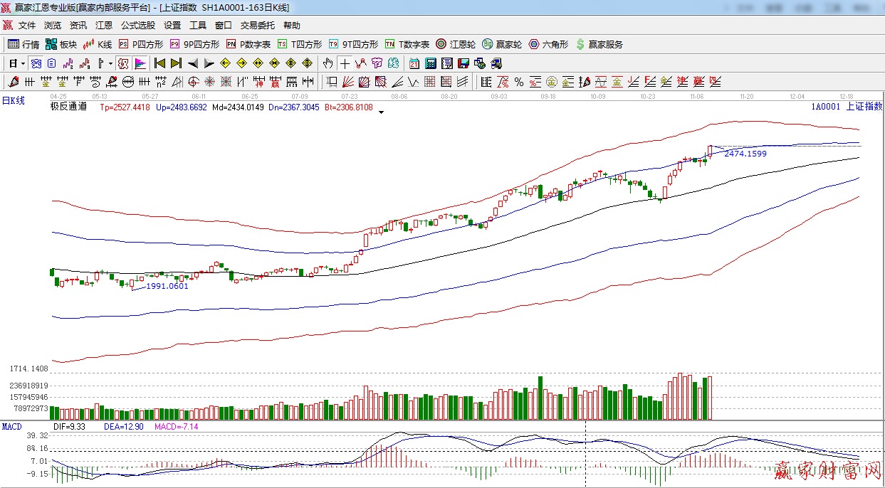 盤面上,受APEC會議確定的重磅利好,金融股和“一帶一路”相關(guān)概念大幅飆升,通用航空、醫(yī)療器械,大飛機(jī)等板塊跌幅靠前,目前上證指數(shù)仍然處在強(qiáng)勢狀態(tài)中,相比之下,創(chuàng)業(yè)板小幅回落,技術(shù)面,明日需關(guān)注上方即將面臨的江恩180度2480點(diǎn)-2489點(diǎn)阻力,預(yù)計周二大盤維持高位震蕩的走勢。