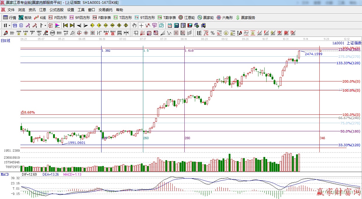 ☆依據(jù)贏家江恩系統(tǒng)黃金時間周期線提示:重點(diǎn)關(guān)注時間窗口是11月24日。