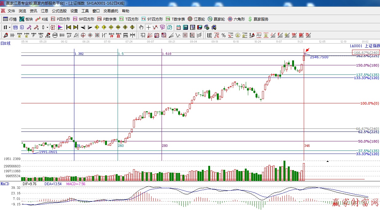 江恩看盤綜述:依據(jù)贏家江恩技術(shù)工具分析得出:周一兩市受降息的重大利好消息刺激,高開高走,強(qiáng)勢上攻至240度2550阻力附近,昨日是前期提到的時間之窗,短期留意后期量能跟進(jìn)情況,預(yù)計(jì)明日將在2550點(diǎn)下方高位震蕩為主,短線操作上追漲需要謹(jǐn)慎,留意前期滯漲個股。