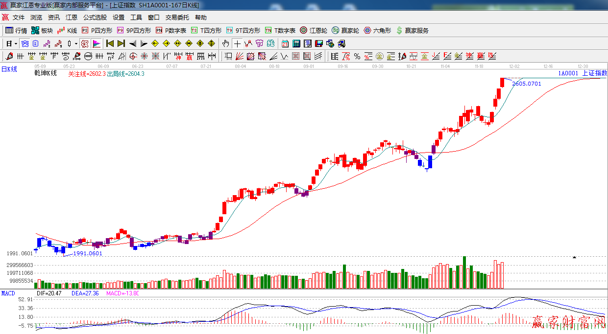 ★依據(jù)贏家江恩系統(tǒng)乾坤K線提示:紅色區(qū)域,短線出局線之上,看多。