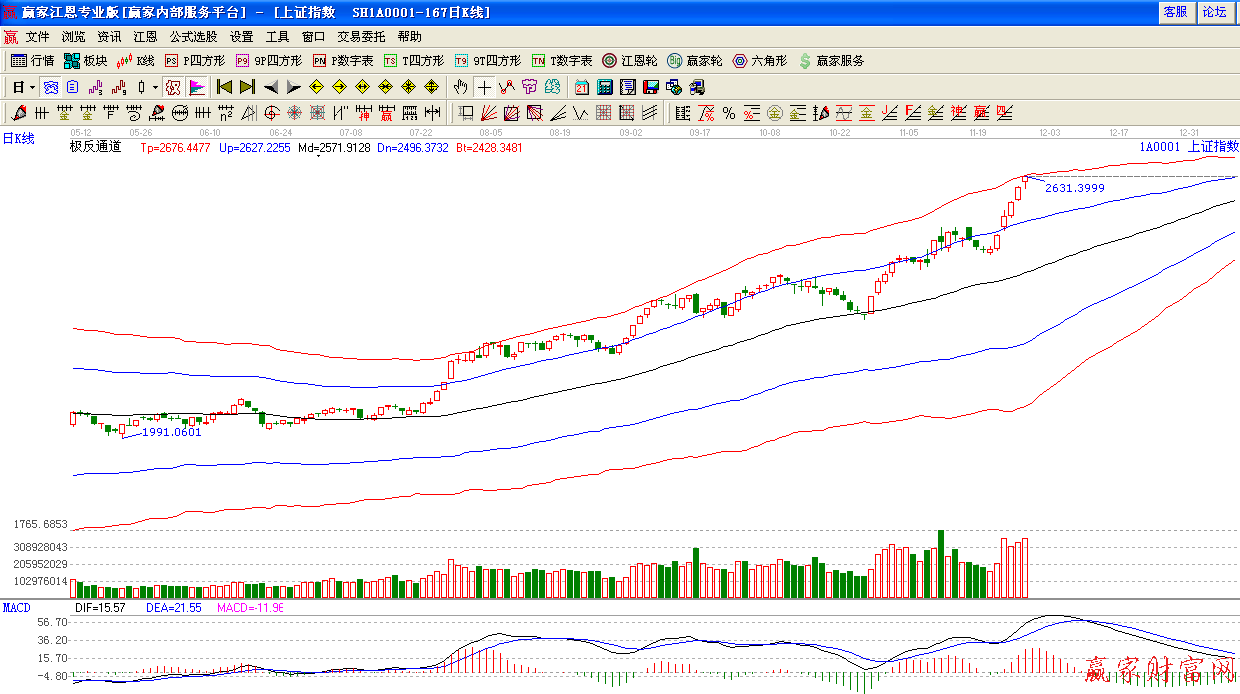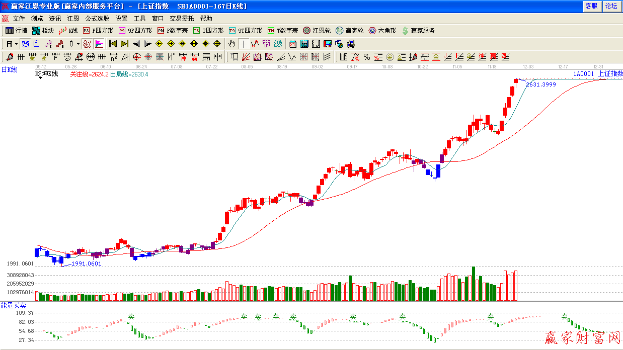 周四,滬深兩市繼續保持逼空上行態勢,創出年內新高,到達極反通道紅色外軌阻力線,上證大漲26.14點,以2630.49點報收,同時,兩市成交量合計達6184.8億元,再創天量。