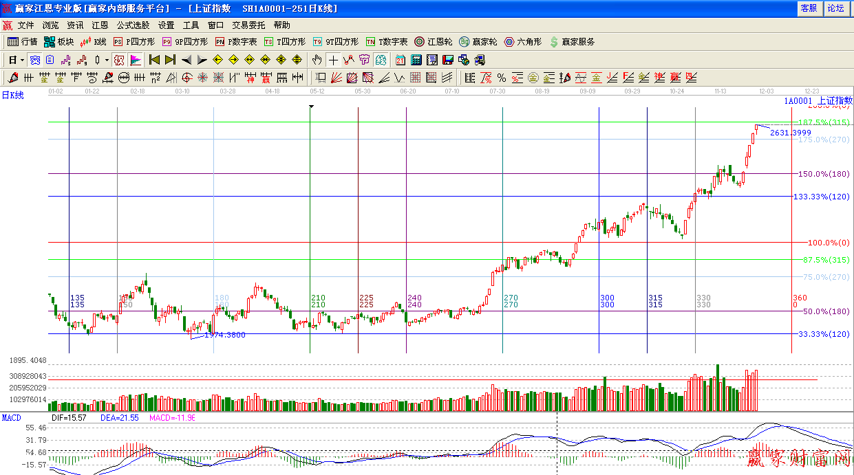 ☆依據贏家江恩系統波段百分比提示:延續強勢,突破270度2585點,轉變為支撐,上方315度2638點。