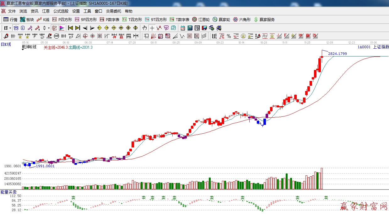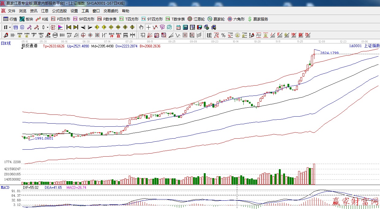 ★依據贏家江恩系統極反通道提示:超強外軌線之外,強勢震蕩,十字星報收,適當控制倉位,注意短線回調風險。