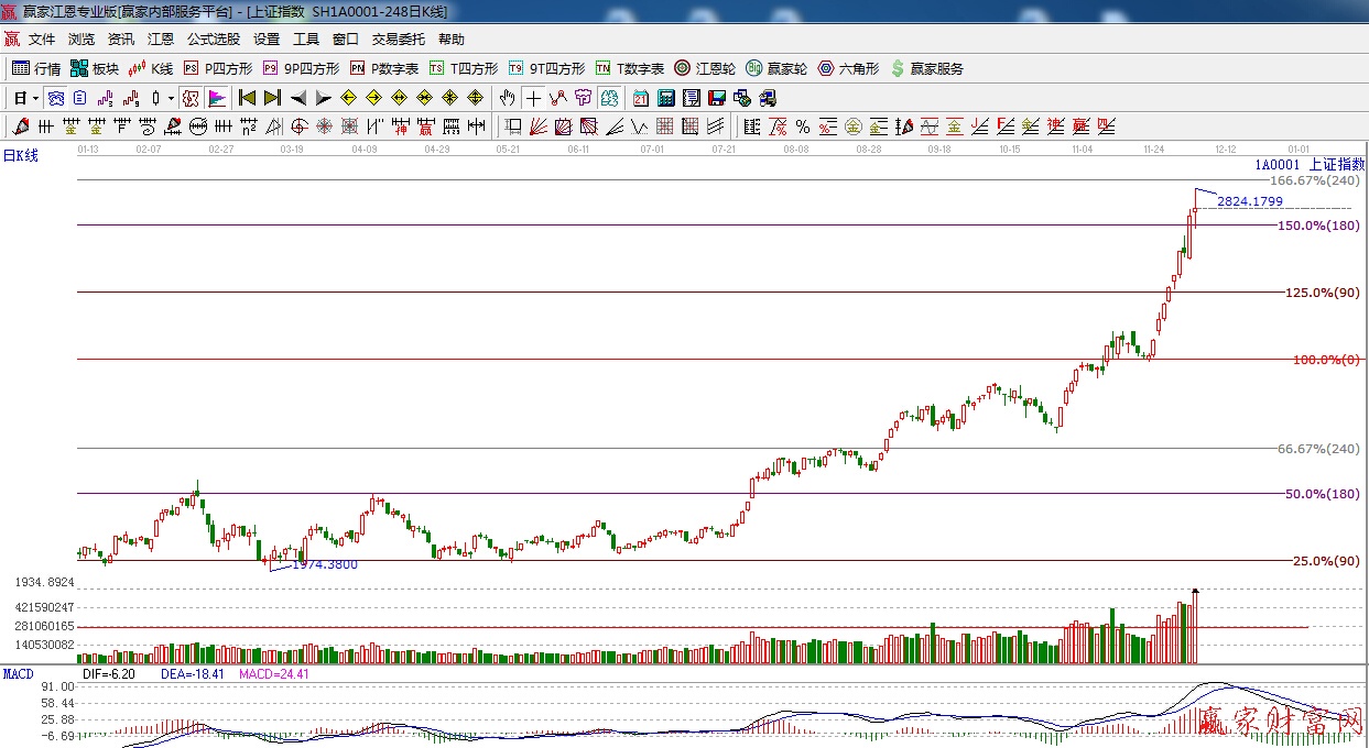 江恩看盤綜述:依據贏家江恩技術工具分析得出:,大盤昨日一度沖擊江恩240度線附近,終盤十字星報收,成交量再度創出歷史新高,權重和題材形成鮮明反差,預計短期高位震蕩。下方支撐關注180度2743點。