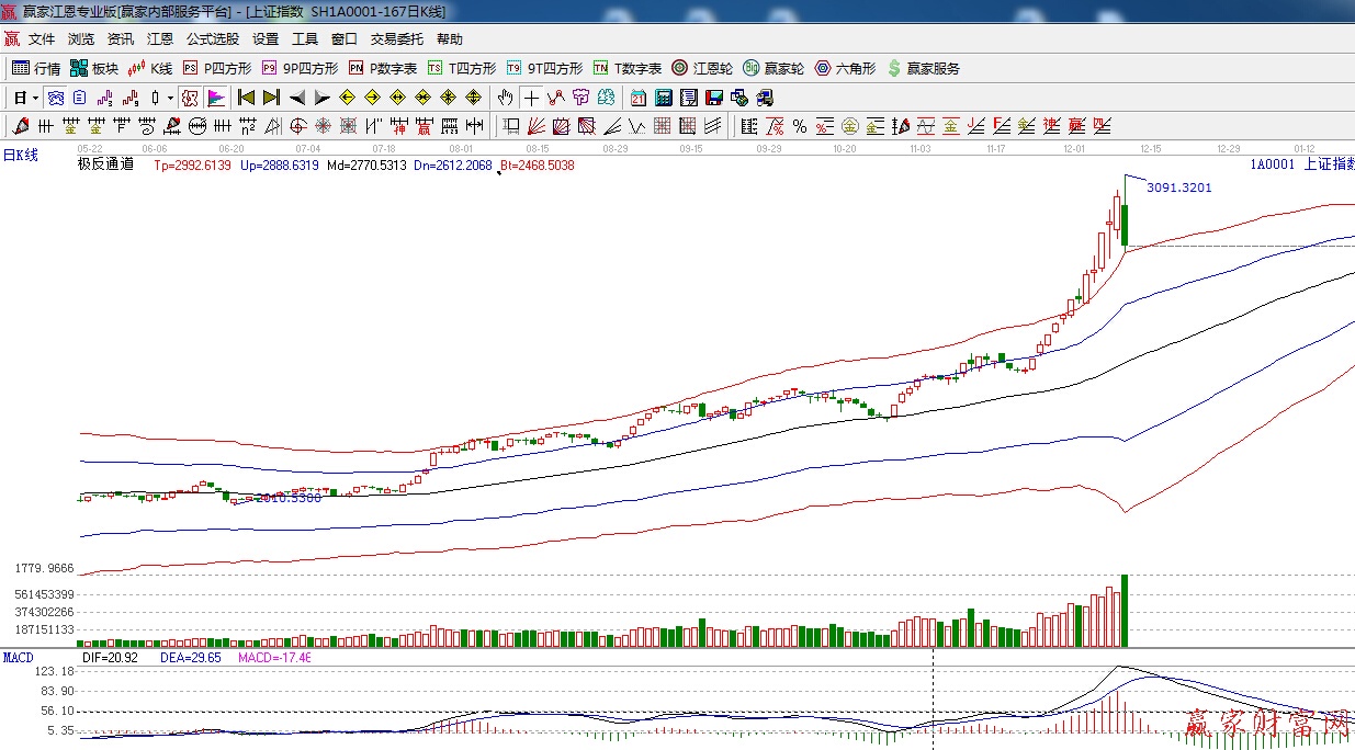 盤面上,幾乎所有版塊下跌,保險(xiǎn)板塊下跌超9。7%居首,衛(wèi)星導(dǎo)航、銀行、中石化系、航天航空等板塊 跌幅靠前,全天23家漲停,跌停近200家,今日指數(shù)如期在昨日分析到的阻力區(qū)間出現(xiàn)巨大獲利盤打壓, 加之融資融券與股指期貨的共振,市場產(chǎn)生了巨幅震蕩,不過面對近期爆炸性的量能,階段性的回調(diào)不 至于影響整體的上行趨勢,當(dāng)前巨震正釋放了主力盤中清洗浮籌的信號(hào)
