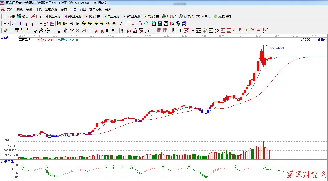 ★依據贏家江恩系統乾坤K線提示:紅色區域,綠色出局線之上,綠色出局線決定短線的方向。