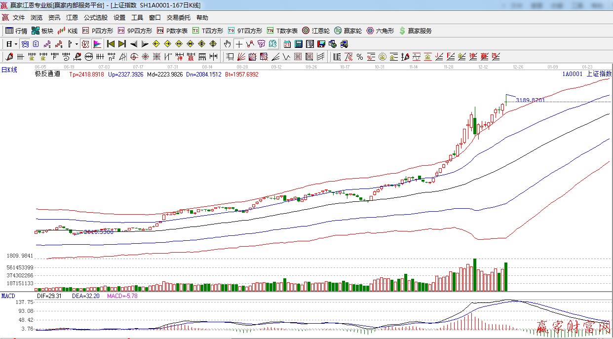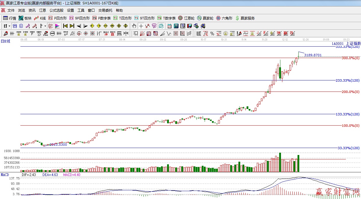 ★依據贏家江恩系統極反通道提示:指數沿紅色外軌線,繼續震蕩走高,依據規則外軌線不破,整體看多趨勢不變。