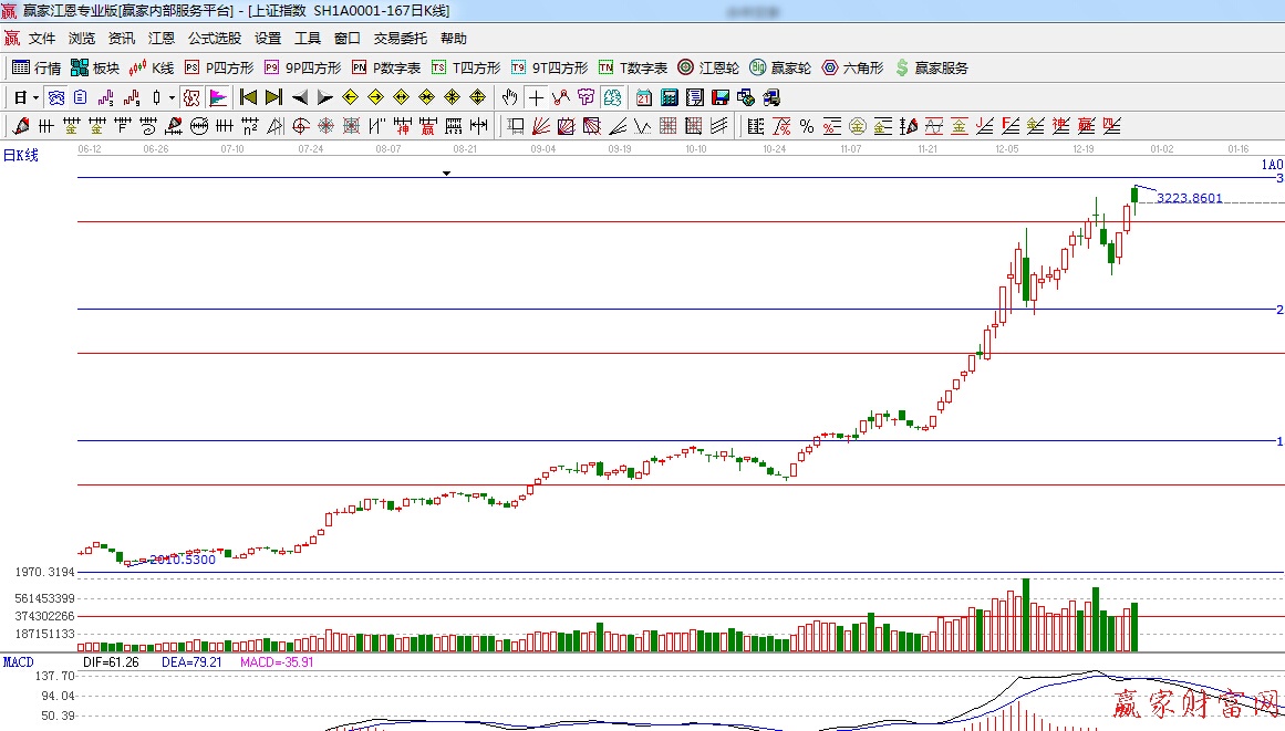 周一早盤滬指高開近2%,在保險、地產、銀行、一帶一路等板塊帶動下最高沖擊3223.86點,創出近五年新高,臨近尾盤,隨著權重板塊的回落指數一度翻綠,創業板指數低開低走最大跌近50點,破1500點關口,盤面上,保險、地產、廣東自貿、白酒等漲幅居前,智能家居、送轉潛力、計算機應用、網絡完全、互聯網金融等跌幅居前,技術面,早盤滬指沖高回落,尾盤回踩江恩0度支撐位回升,量能方面呈量價背離形態,明日繼續關注江恩0度3114點支撐,此位置不破,短期上升趨勢不變,破位短線看空,預計短期指數高位震蕩為主,操作上已不宜盲目追高。