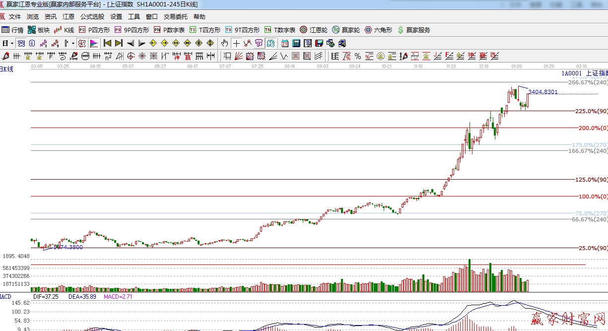 ★依據贏家江恩理論系統波段百分比提示:滬指在江恩90度支撐位經過兩日縮量十字星后,如期反彈,上方阻力是240度,270度 ,3440點,3490點。