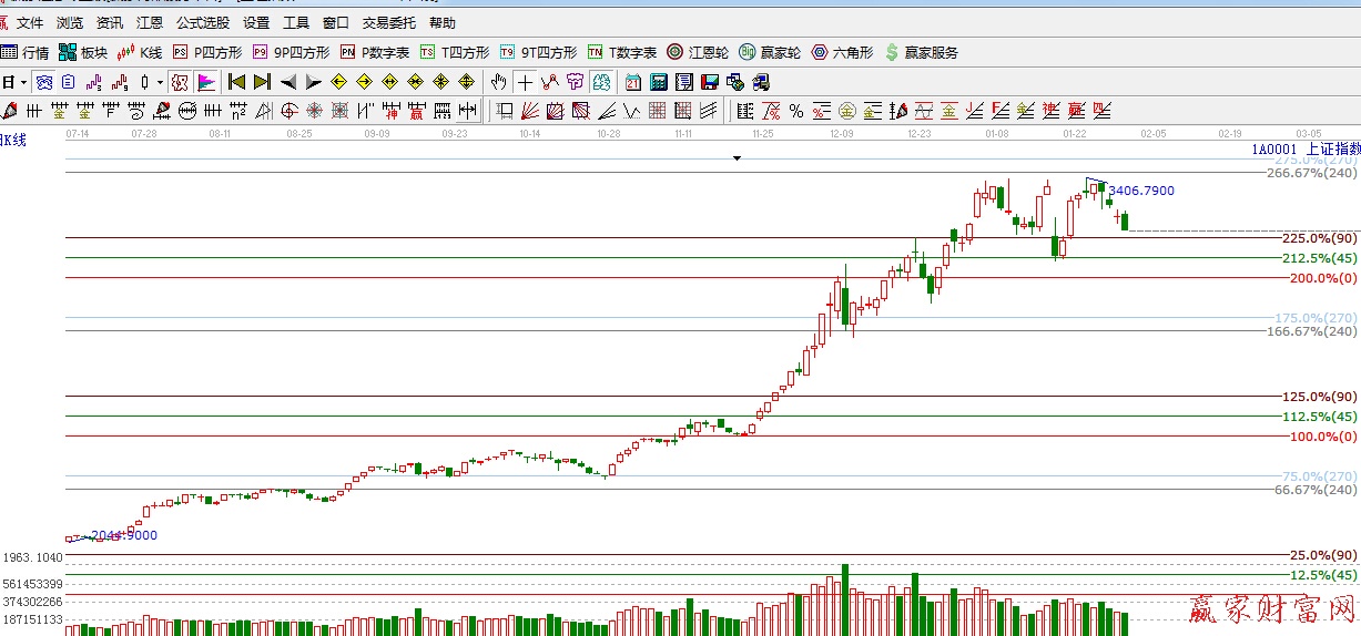 江恩看盤綜述:依據贏家江恩技術工具分析得出:周五滬深兩市高開低走,截至收盤,滬指逼近江恩90度(3188點)附近,整體而言,由于春節臨近,市場流動性將逐步趨緊,短期休整或將持續,在下一時間窗口2月6日之前整體難有較好表現,下周一關注第一目標位是江恩90度3188點附近,此位置不破或將有小幅反抽。操作上,建議投資者控制倉位前提下挖掘政策紅利股和滯漲價值股。