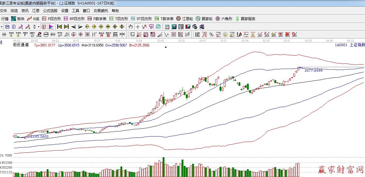 ★依據贏家江恩理論系統極反通道提示:今日滬指高開高走,午盤突破藍色外軌線3551點,明日考驗藍色外軌線支撐有有效性,短期看多。