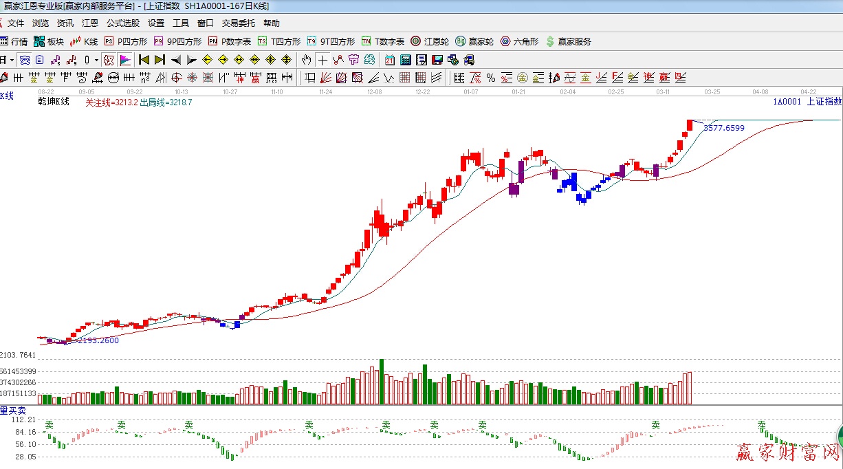 ★依據贏家江恩理論系統乾坤K線提示:紅色k線,可操作區域,趨勢看多。