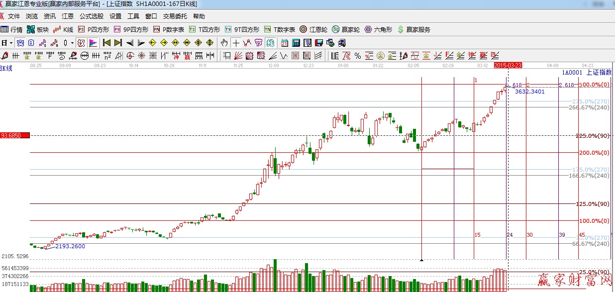 江恩看盤綜述:依據(jù)贏家江恩技術(shù)工具分析得出:周五滬指再創(chuàng)新高,午后沖高至江恩0度位置3635點(diǎn)遇阻,盤面上整體人氣依然很高,下周重點(diǎn)留意0度位置阻力,此位置如不能突破短期將震蕩整理為主。下一短線時(shí)間窗口是 3月23日,3月30日。操作上,建議投資者逢低介入國(guó)資改革、年報(bào)超預(yù)期個(gè)股,切莫輕易追漲殺跌.
