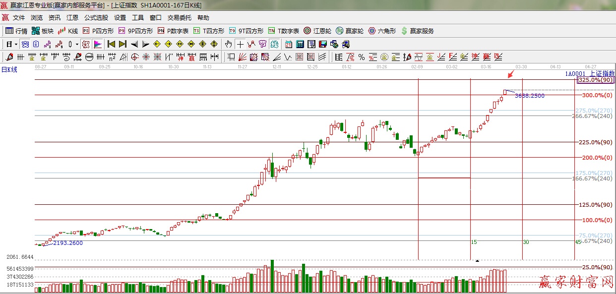 江恩看盤綜述:依據贏家江恩技術工具分析得出:早盤滬指跳空高開突破江恩0度位置,之后一路震蕩走高,市場盤面強勢不改,滬指上行同時伴隨成交量快速回升,顯示本輪行情的上行走勢并未改變,依據江恩工具分析,上方下一個阻力將是江恩90度位置3783點附近。操作上,逢低關注國資改革、年報超預期個股,對于短線急漲的個股要控制好倉位。