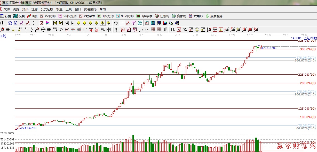 ★依據(jù)贏家江恩理論系統(tǒng)波段百分比提示:目前支撐依然是江恩0度位置3655點,上方下一個阻力將是江恩90度位置3783點附近。