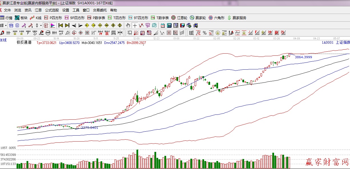 ★依據贏家江恩理論系統極反通道提示:上方紅色外軌強勢區域,震蕩攀升,短期謹慎為主。