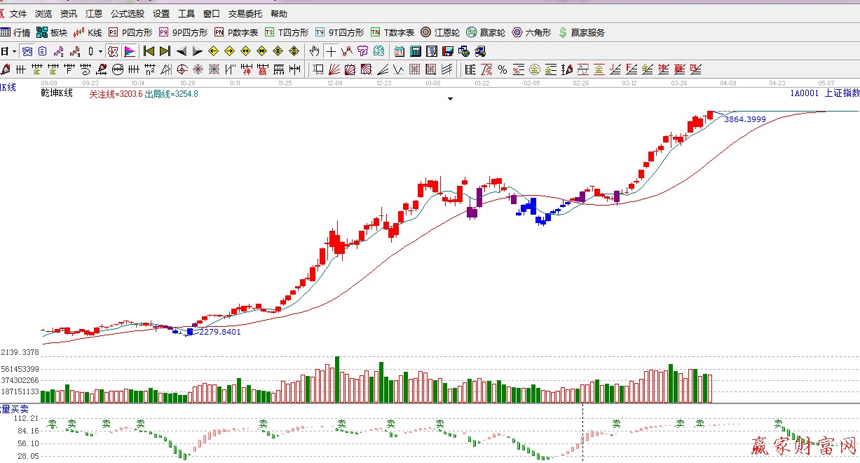 ★依據贏家江恩理論系統乾坤K線提示:紅色k線,綠色線上方,留意綠色短線出局線,綠色線不破,繼續看多。
