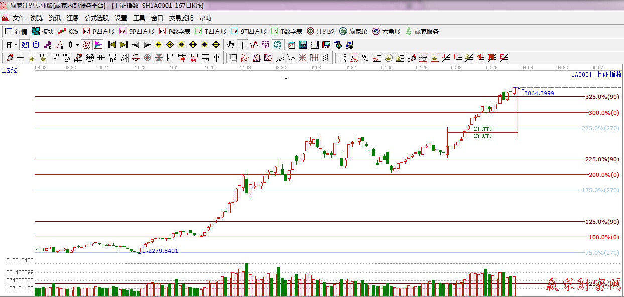★依據贏家江恩理論系統波段百分比提示:今日回踩江恩90度3783點附近,繼續震蕩攀升,依據規則下一目標位是江恩270度4081點。