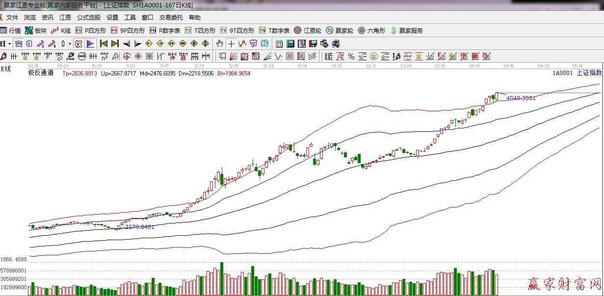 ★依據贏家江恩理論系統極反通道提示:極反通道紅色外軌線支撐上方,震蕩整理,謹慎看多。