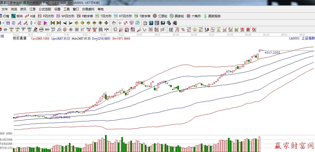 極反通道提示:極反通道紅色外軌線支撐上方,延續強勢,短期繼續謹慎看多。