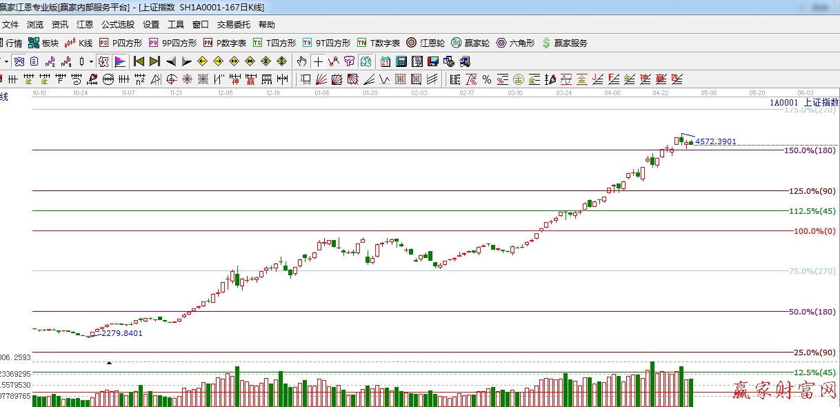 ★依據(jù)贏家江恩理論系統(tǒng)波段百分比提示:江恩百分比180度4300點(diǎn)附近支撐線,此位置不破整體趨勢(shì)不變,上方下一目標(biāo)位是270度,4700點(diǎn)附近。