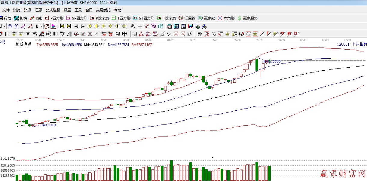 江恩看盤綜述:依據贏家江恩技術工具分析得出:今日滬深兩市維持震蕩態勢,滬指在4900點附近震蕩,目前市場依舊是前期5000點的余震,支撐留意極反通道藍色外軌線4760附近,下一時間窗口在6月8日附近,短期的震蕩將有利于后市的進一步走高,操作上,投資者可以利用震蕩之際,繼續低吸受益經濟刺激計劃的個股。