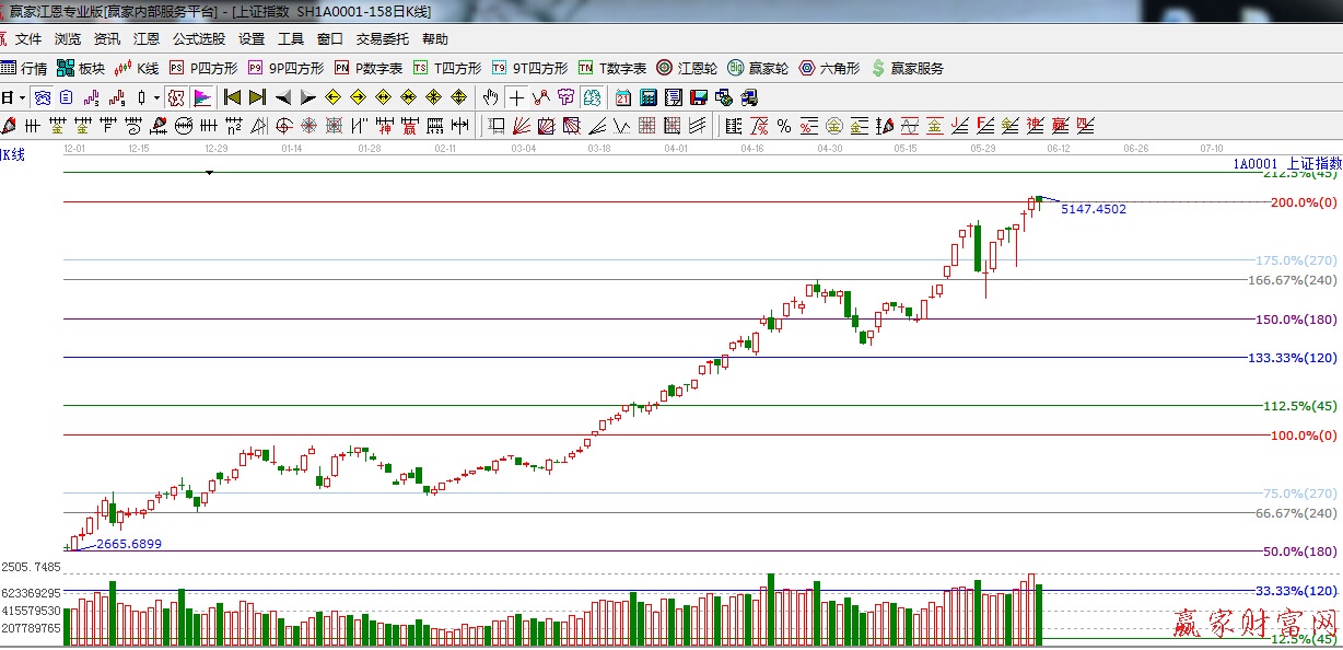 ★依據贏家江恩理論系統波段百分比提示:滬指在權重大帶動下站上5100點,下一目標是江恩45度5300附近點。