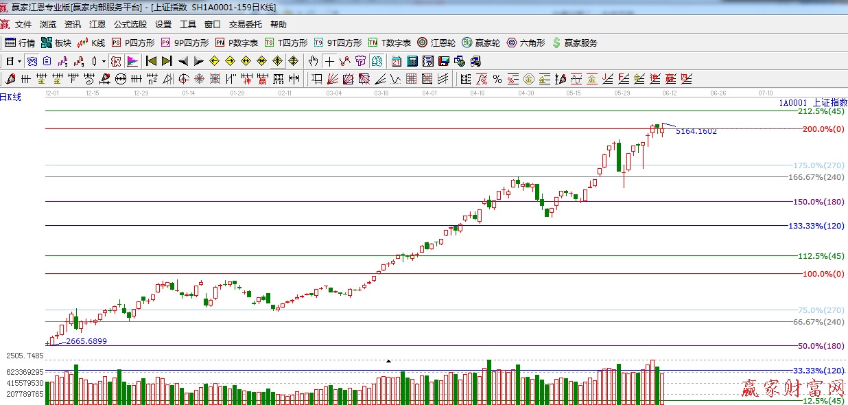 ★依據贏家江恩理論系統波段百分比提示:滬指在權重大帶動下站上5100點,下一目標是江恩45度5300附近點。